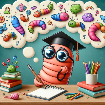 책상에 앉아 여러 책들 사이에서 상상하는 애벌레.