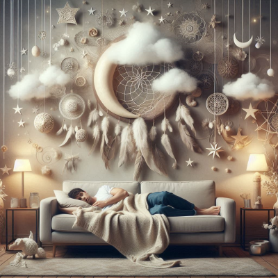 꿈의 상징과 함께 편안히 쉬는 사람과 그 주위의 평화로운 공간입니다.